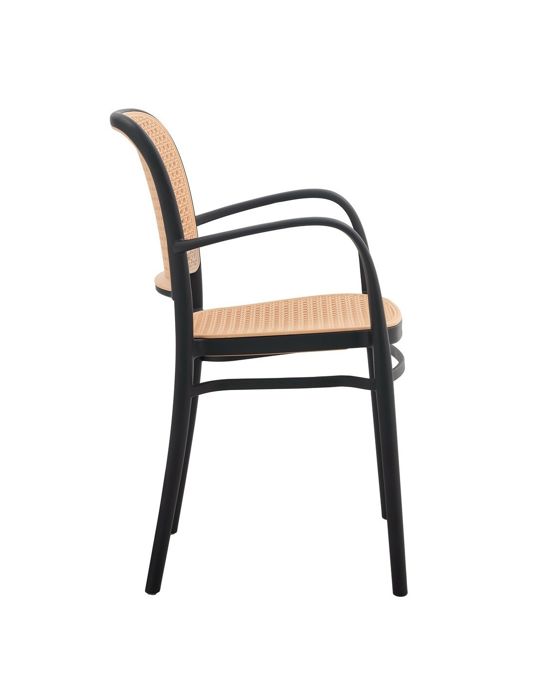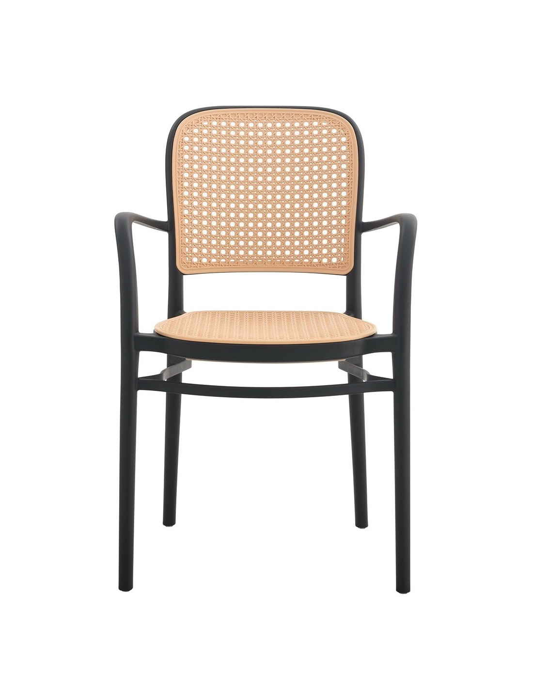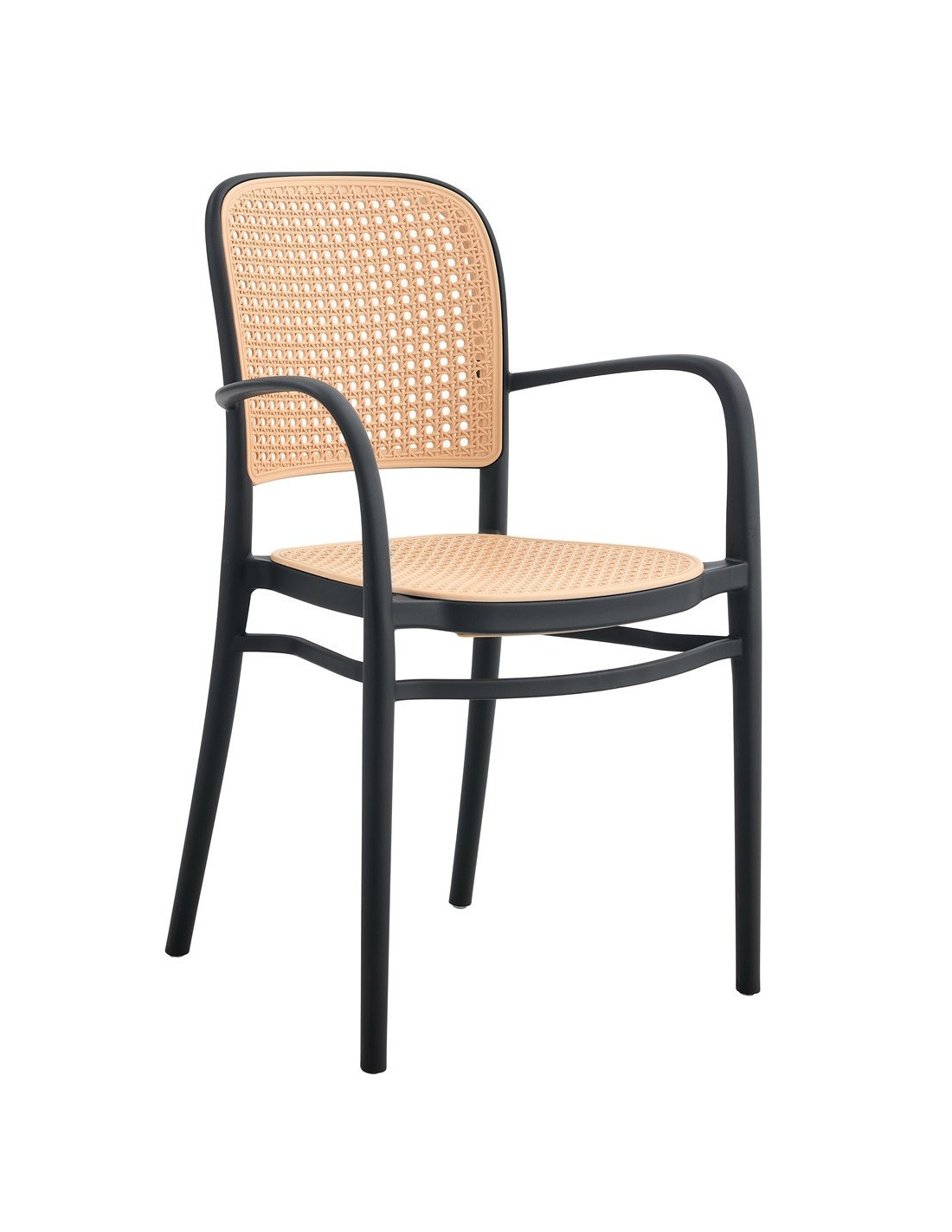 -Fabricado 100 % con Polipropileno, armazón de color negro con asiento y respaldo en rejilla beige.