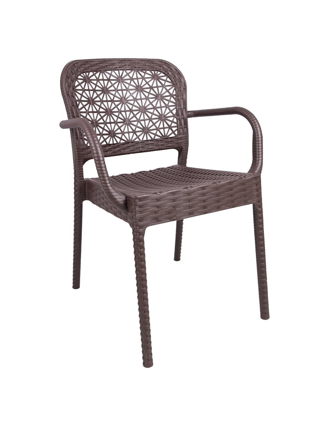 Sillón apilable, imitación a rattán, polipropileno chocolate. Uso en exterior e interior. Otros colores disponibles.