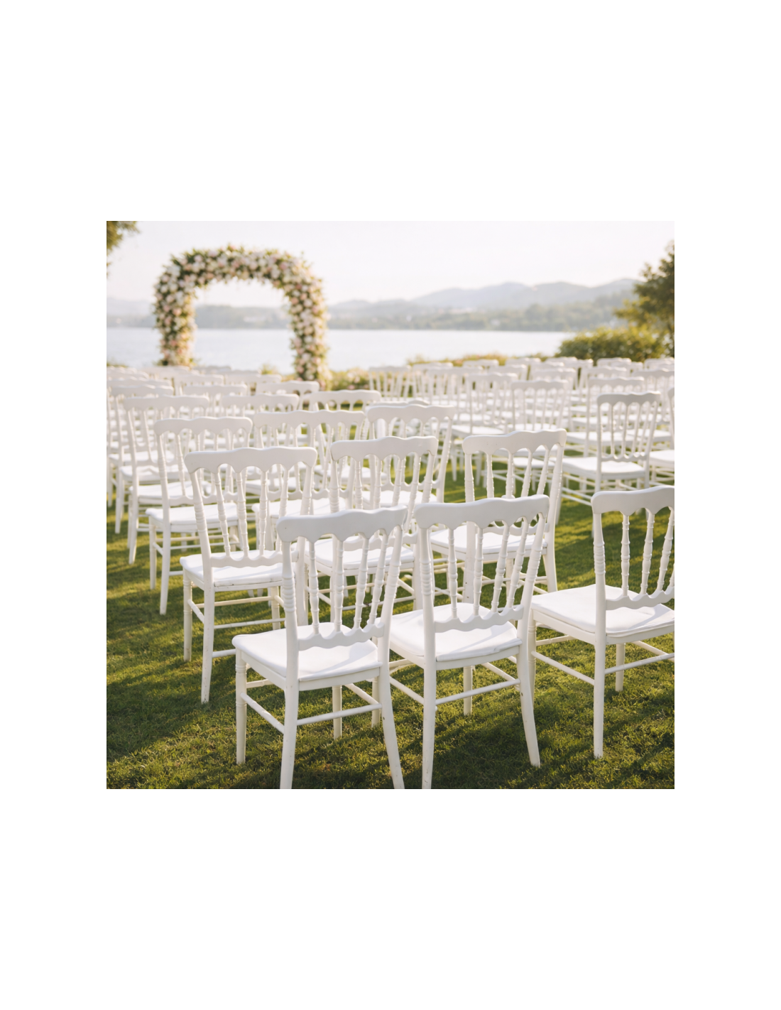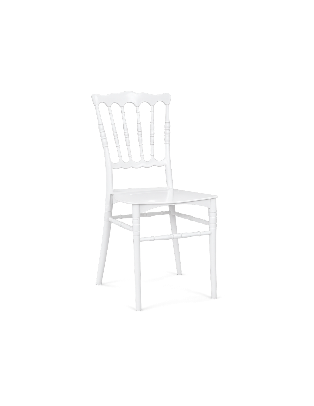 Silla de catering y eventos, apilable, polipropileno de color blanco. Uso en exterior e interior. Silla muy resistente para uso en hostelería y doméstico. Inyección asistida por gas.