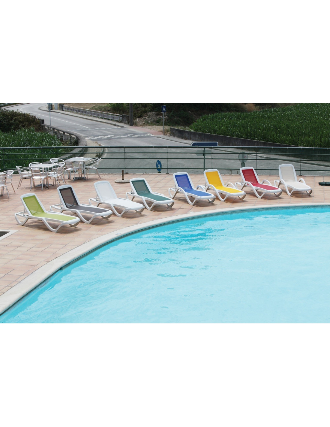 -Colores y combinaciones posibles: Con estructura de polipropileno de color blanco: Textilene de color: azul, amarillo, blanco, rojo, verde oscuro, Beige, verde lima y negro.